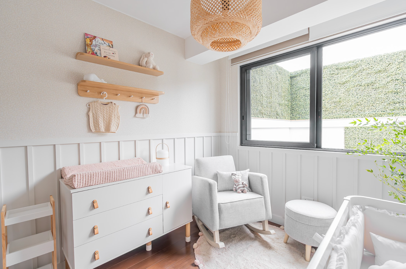 Alejandra & Álvaro nos encargaron la transformación del dormitorio de Macarena. Lo que antes era un cuarto de depósito, se convirtió en un espacio para la nueva integrante de la familia. Era necesario que sea funcional, en almacenamiento y distribución, pero que también sea lindo y cálido. Tonos suaves, detalles en mimbre y madera, papel tapiz y molduras nos ayudaron a darle vida a este dormitorio tan esperado y especial.