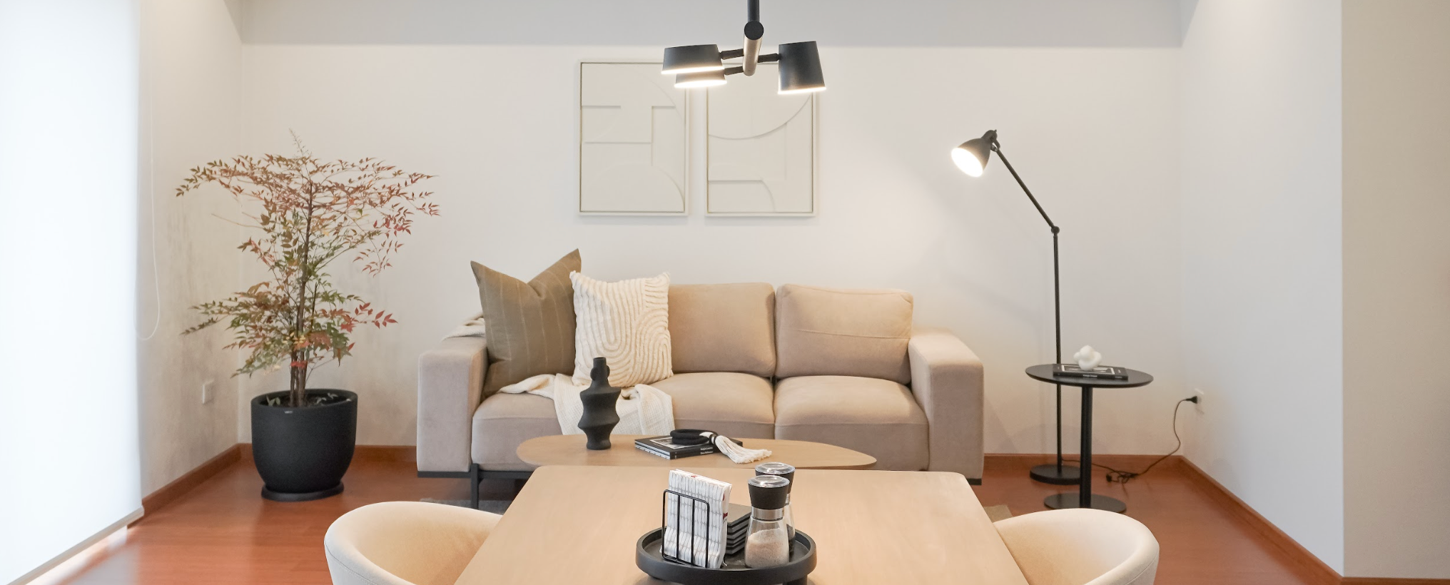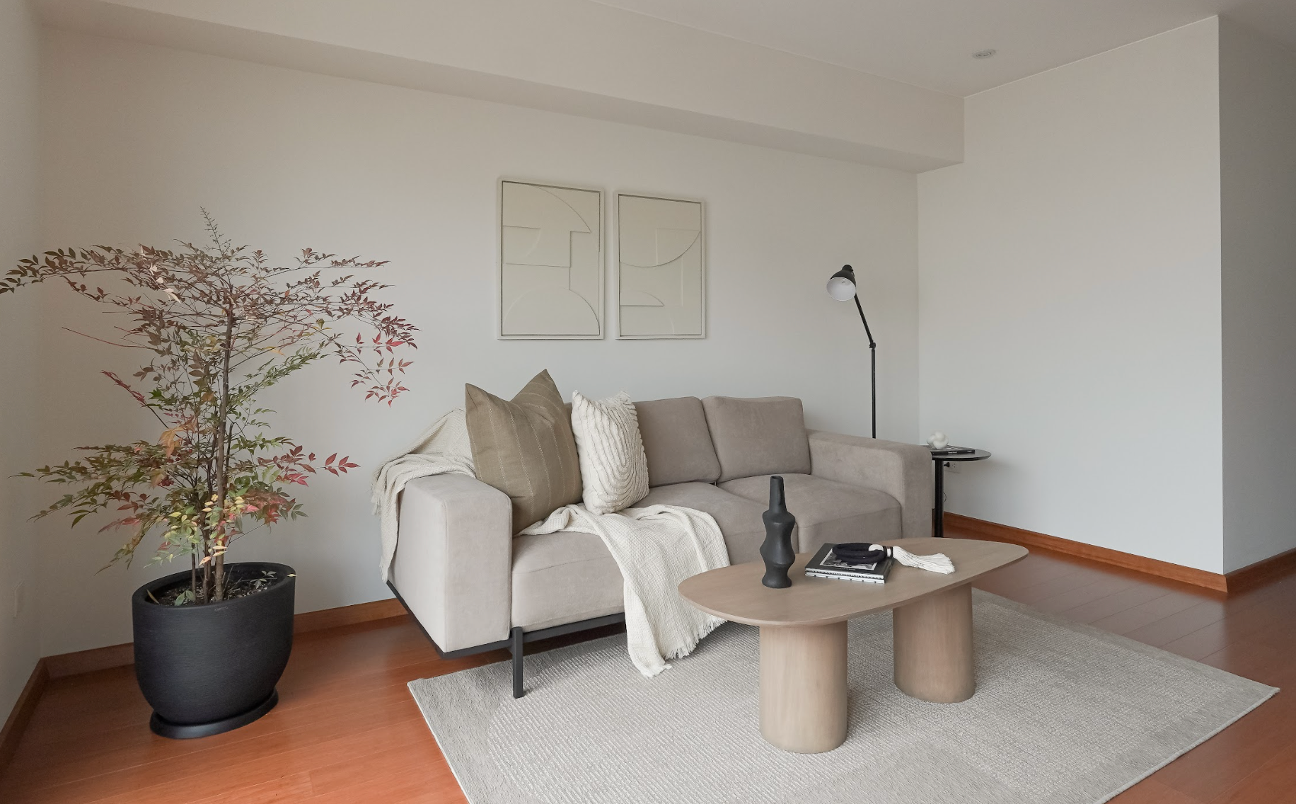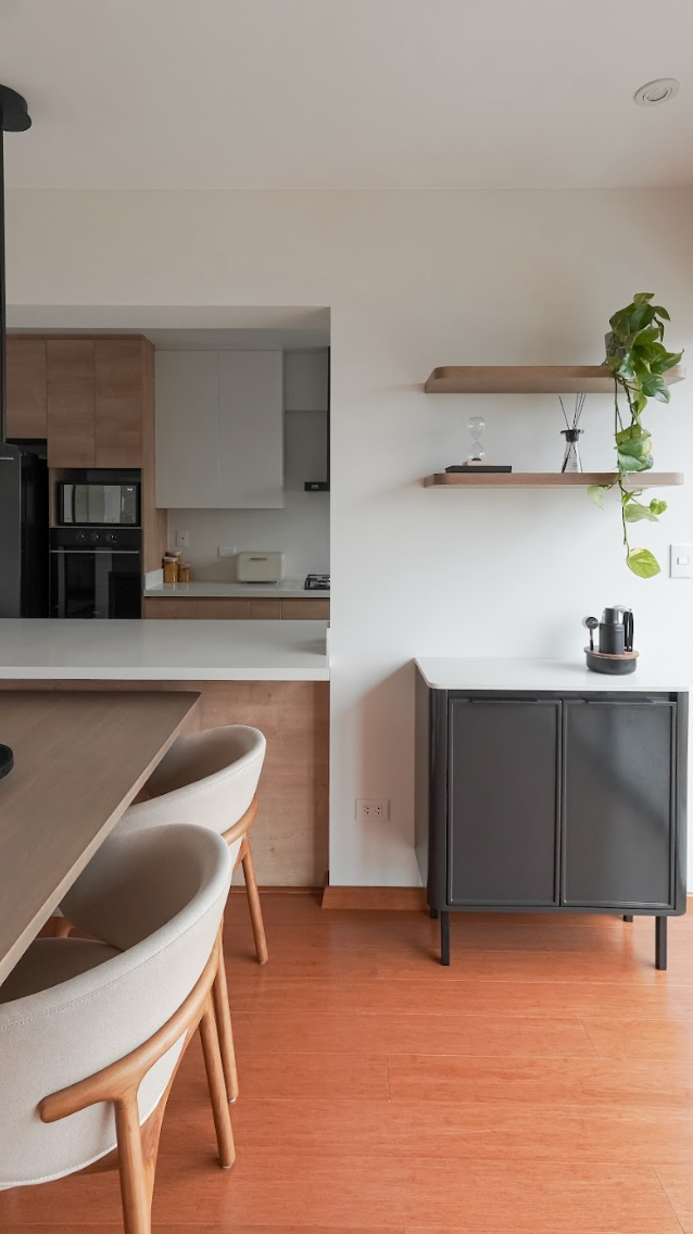 Acabados y texturas que se entrelazan con una paleta cálida y acentos en negro, transportándote a un ambiente acogedor donde cada detalle te invita al descanso.