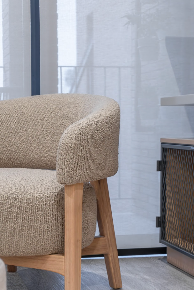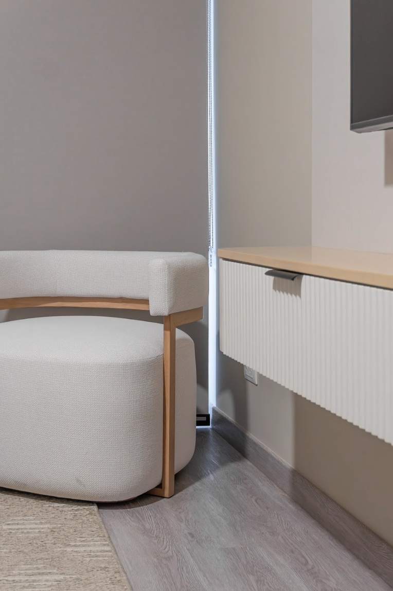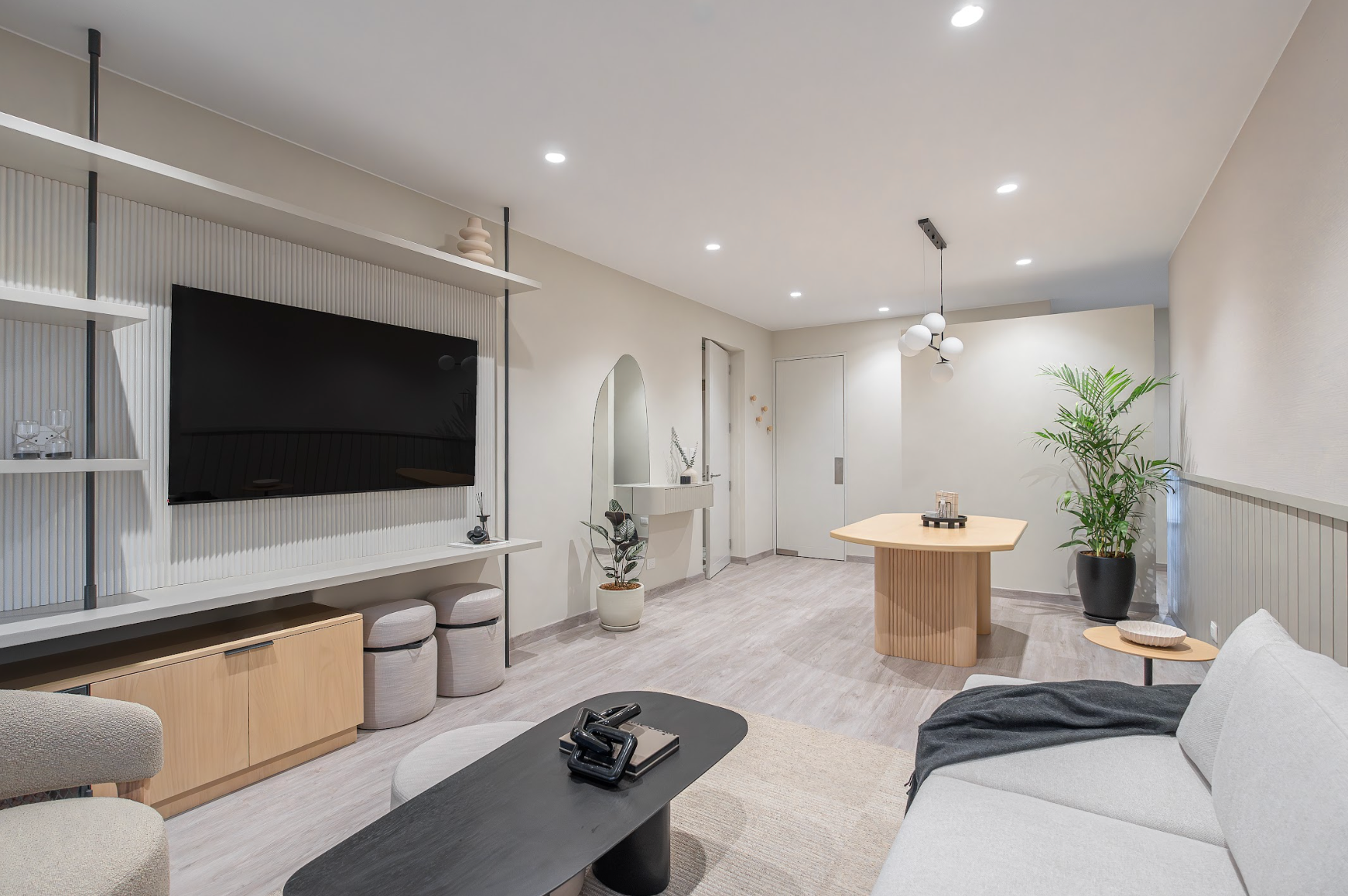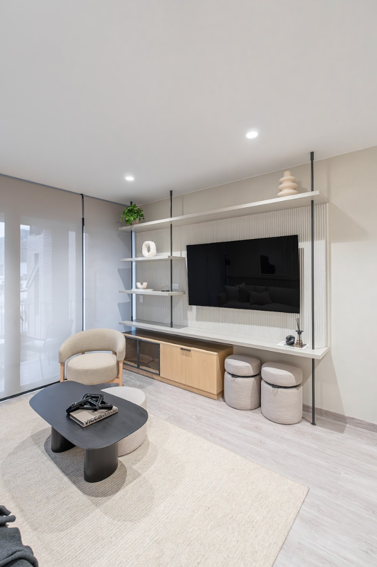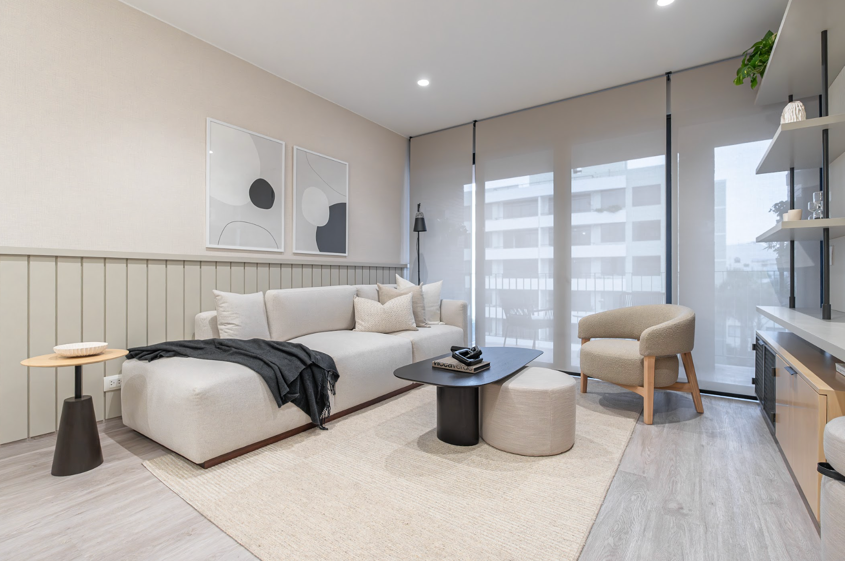 Para la sala comedor y dormitorio de Carla & Erick optamos por espacios donde se respire calma solo con estar ahí. La iluminación y la curaduría de elementos, le dan esa calidez que te invita a quedarte un ratito más.