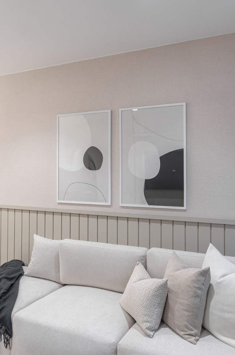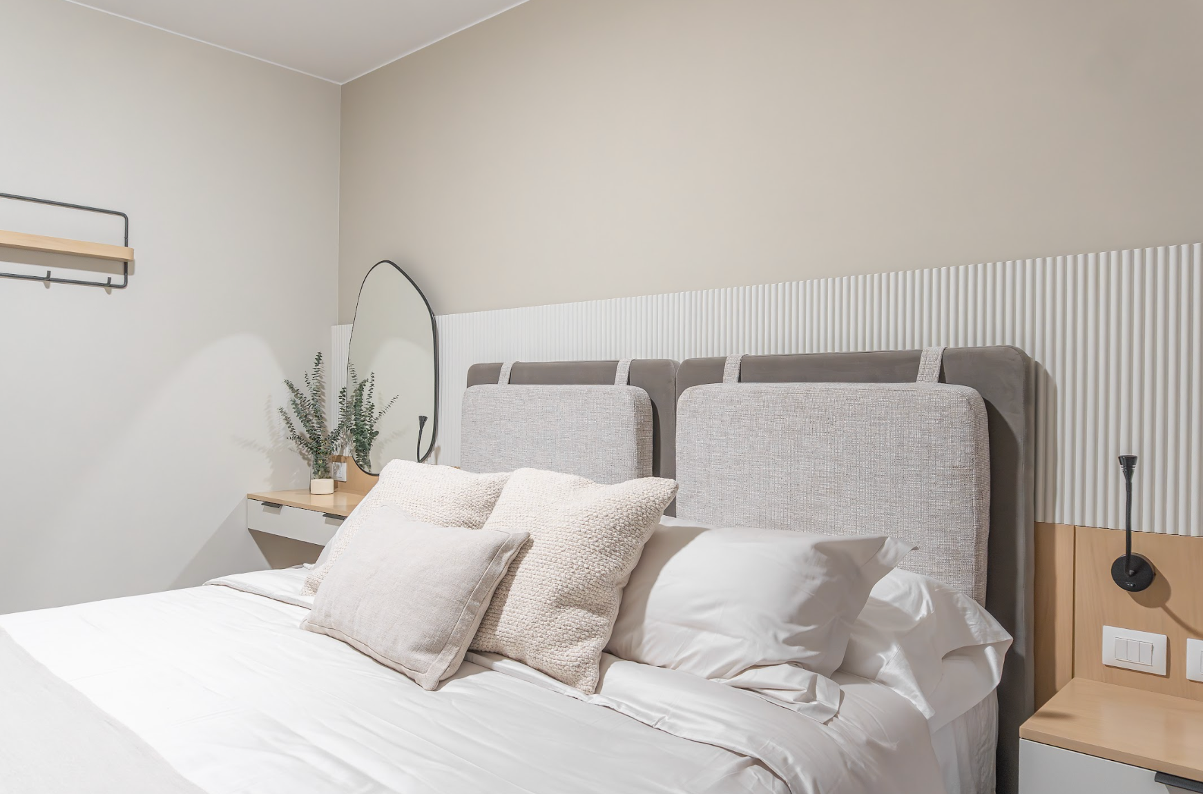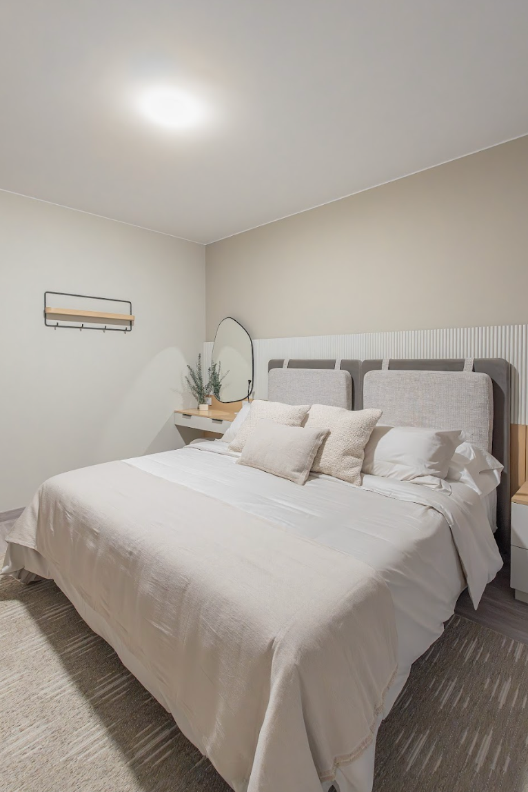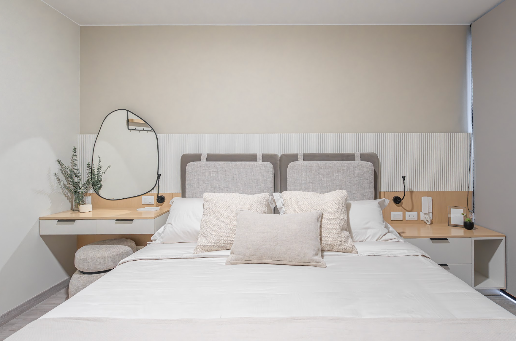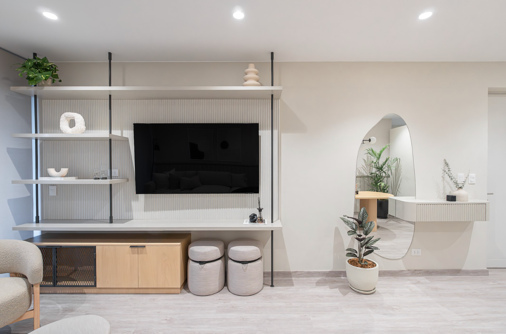 Para la sala comedor y dormitorio de Carla & Erick optamos por espacios donde se respire calma solo con estar ahí. La iluminación y la curaduría de elementos, le dan esa calidez que te invita a quedarte un ratito más.