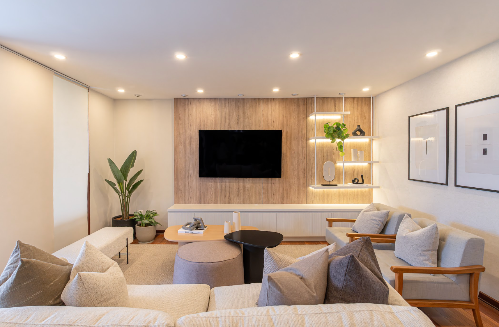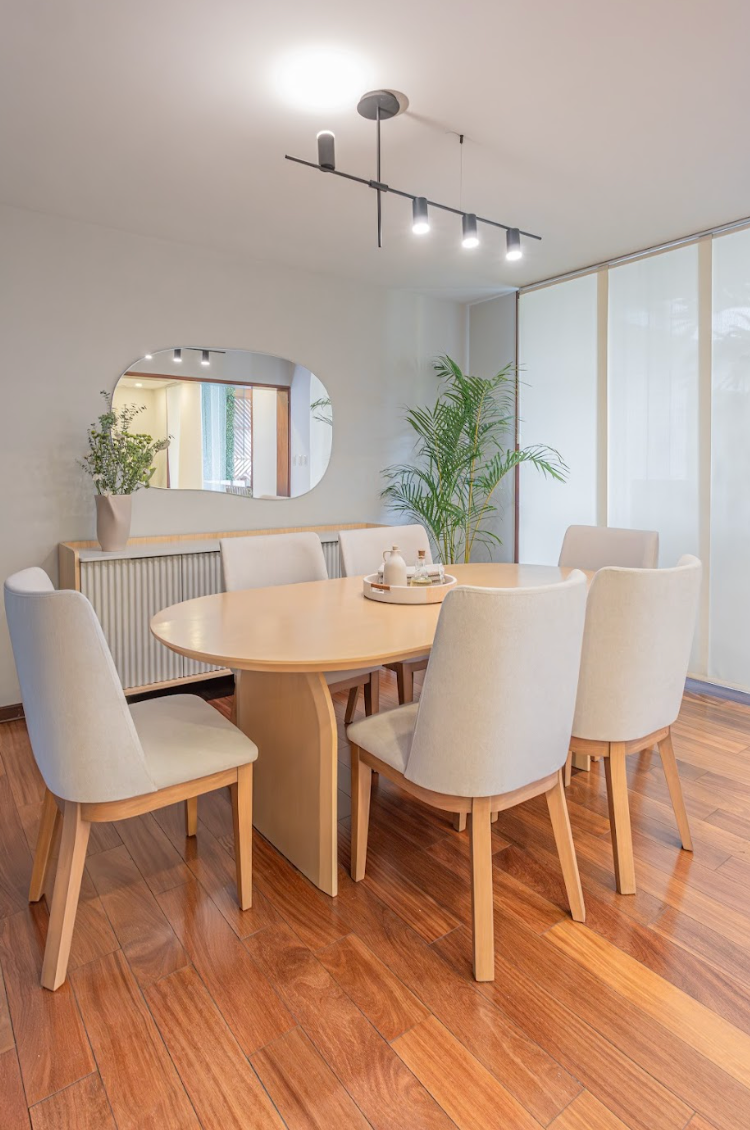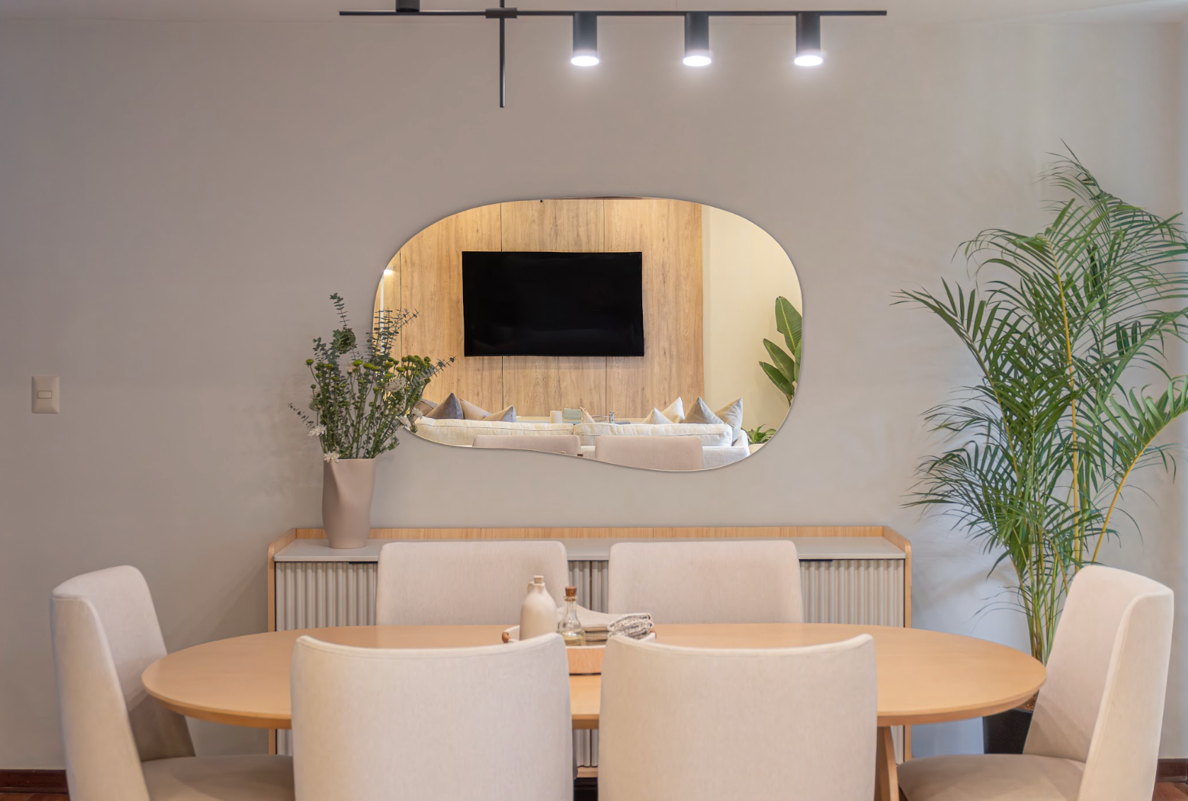 Conoce la sala comedor de Eduardo: un espacio moderno y cálido que juega con colores que se complementan y acabados que conversan entre sí, creando un look versátil y vibrante. La retroiluminación, las plantas y las siluetas orgánicas le suman ese toque final que te hace sentir en casa.