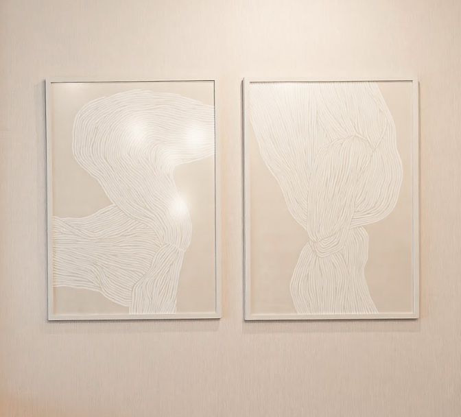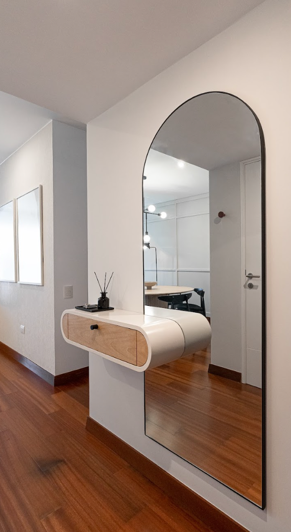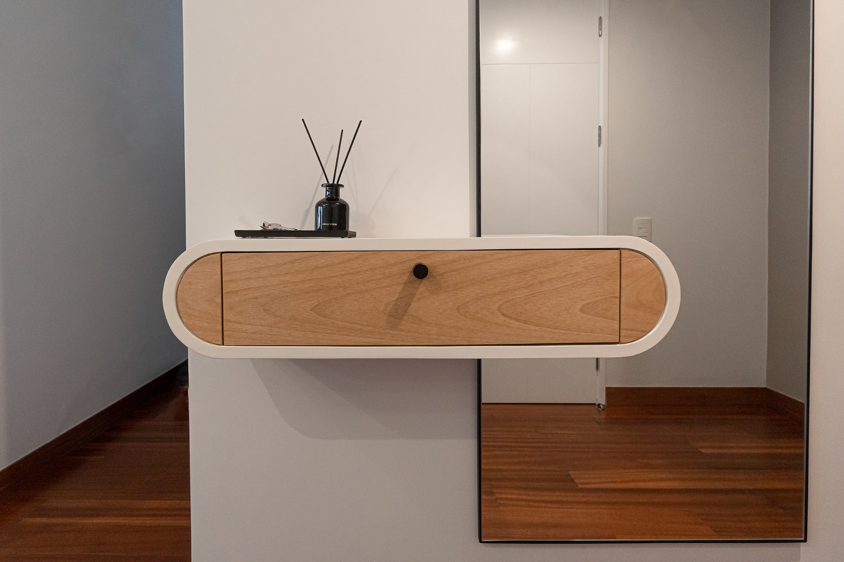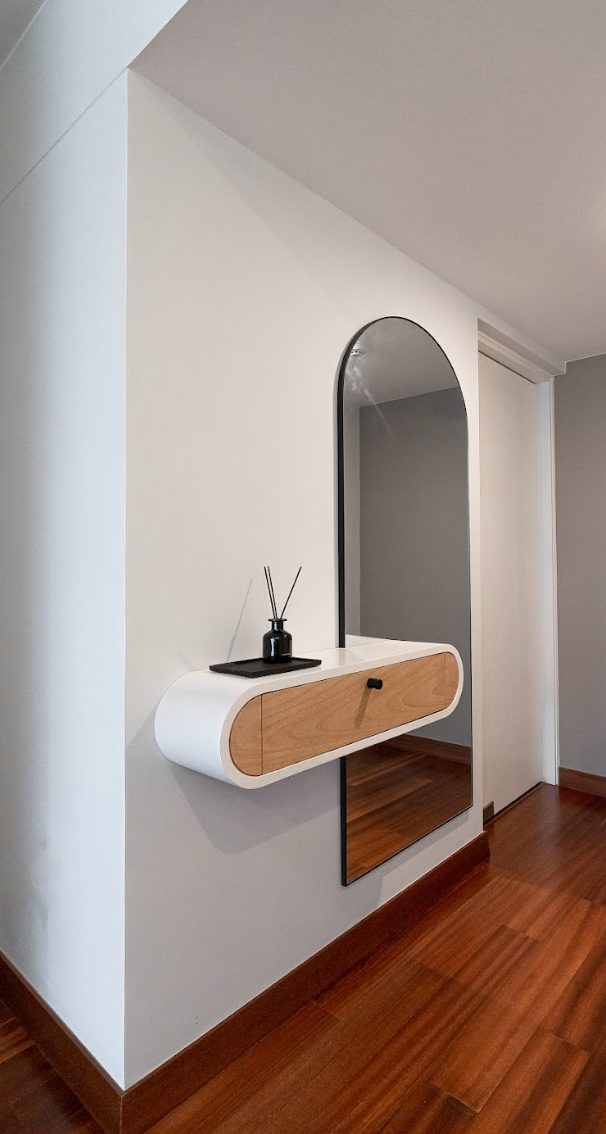 Una propuesta funcional: una consola flotante que les permita organizarse a diario, sobrepuesta a un espejo en arco. Juntos logran transmitir calma y orden al llegar a casa.