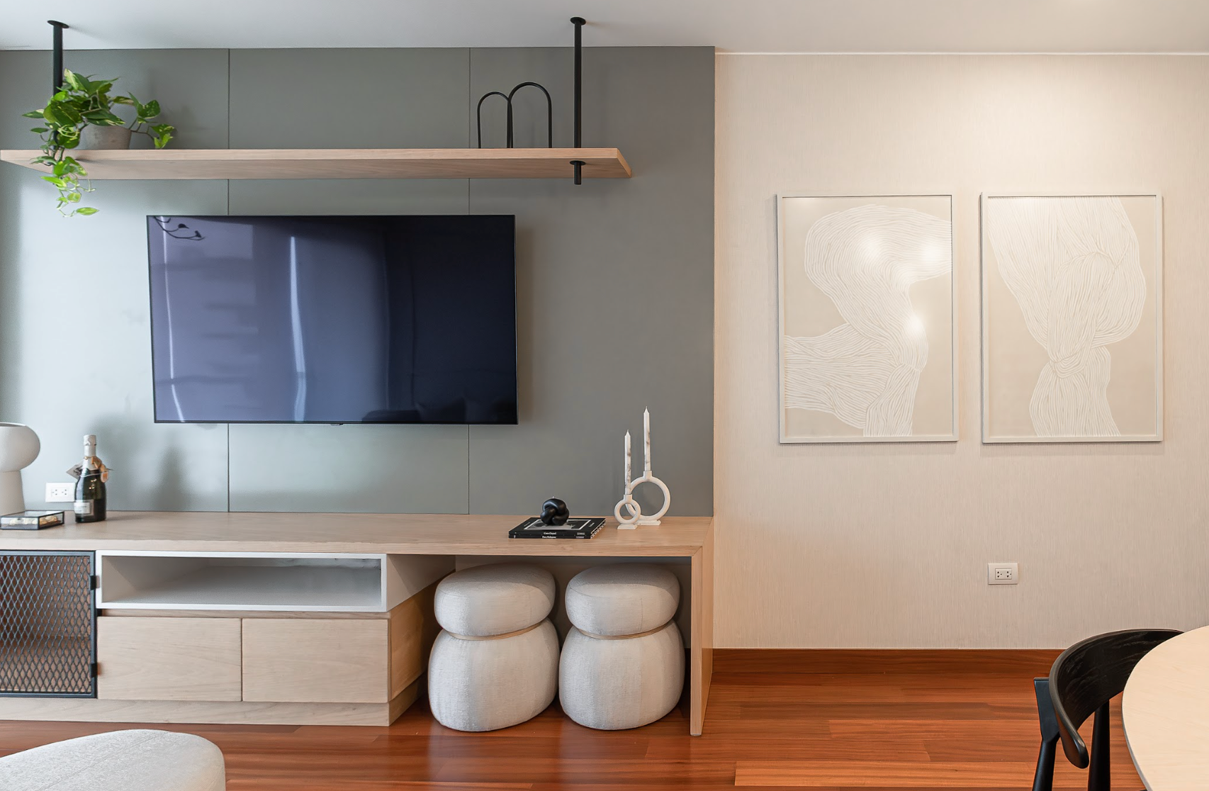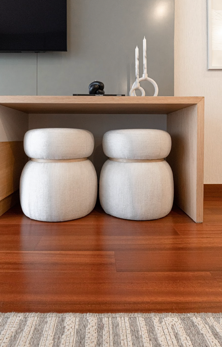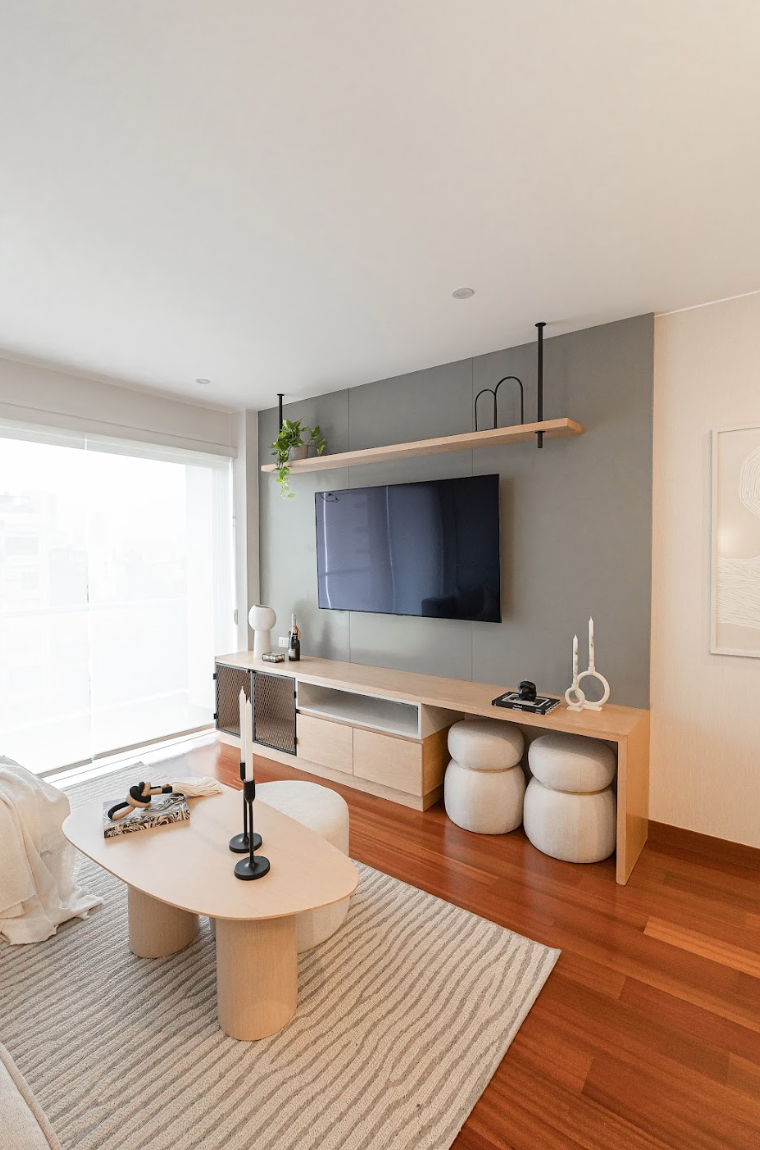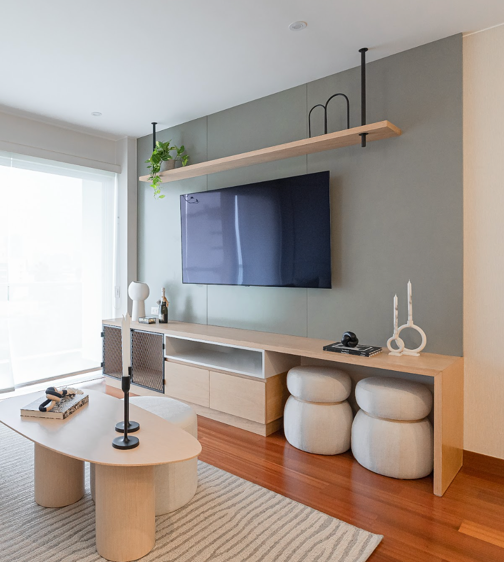 Un espacio cálido y moderno con tonos neutrales y acentos de color. Diseñamos una consola para TV con repisas para decoración y almacenamiento, así como una consola con dos puffs de apoyo. De esta manera optimizamos el espacio y lo volvemos muy versátil.