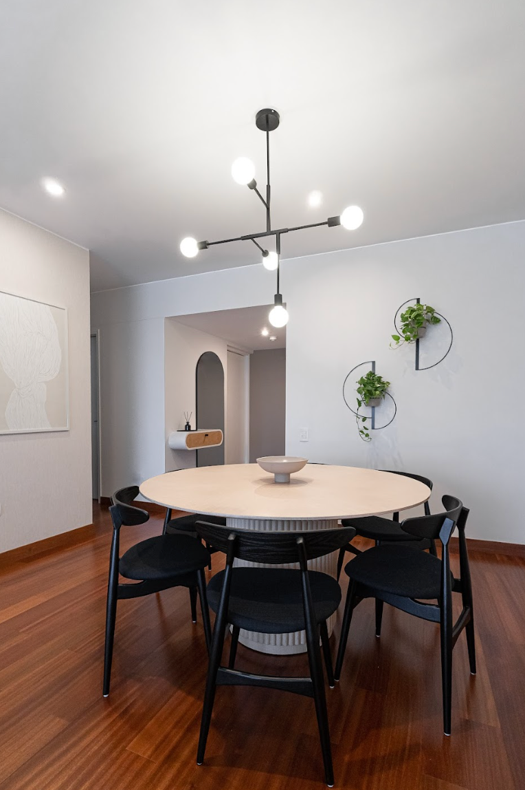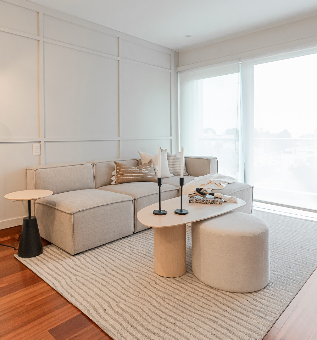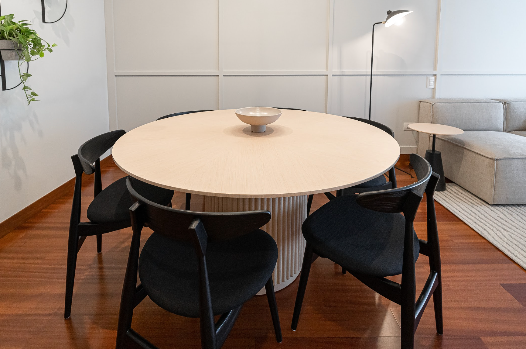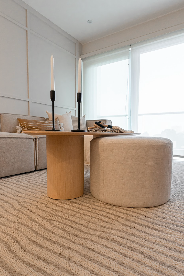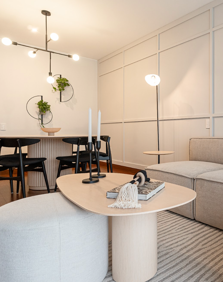 Un espacio cálido y moderno con tonos neutrales y acentos de color. Diseñamos una consola para TV con repisas para decoración y almacenamiento, así como una consola con dos puffs de apoyo. De esta manera optimizamos el espacio y lo volvemos muy versátil.