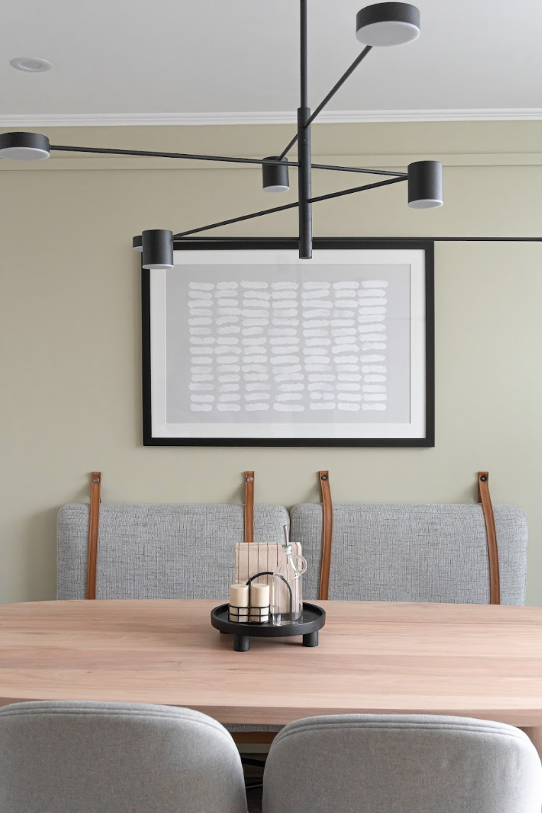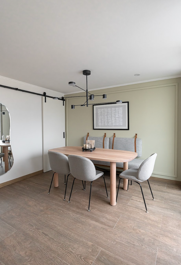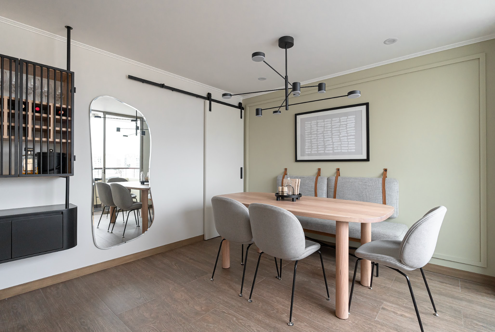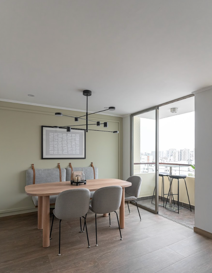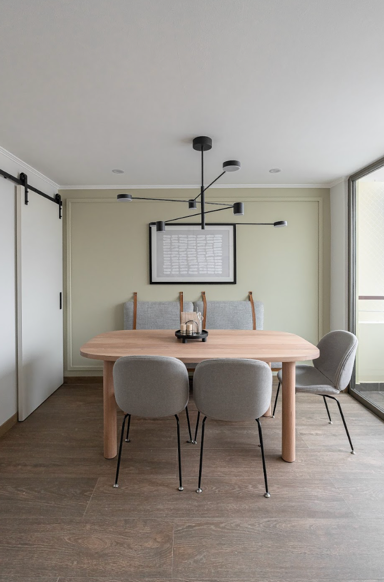 Nos encanta darle vida a nuestros diseños trabajando con acento de color. Amamos como quedó el verde como remate visual para la sala comedor de Laura & Juan. Junto a las texturas, mobiliario de madera y acentos en negro creamos un espacio que transmite calma y, lo más importante, refleja el estilo de nuestros clientes.