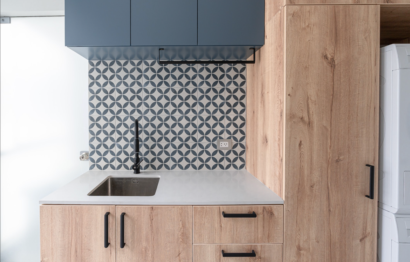 La trama de mosaicos y acento de color azul, combinado con el mobiliario hecho a medida y los múltiples compartimentos ocultos, convierten este espacio en uno muy funcional y a la vez lleno de estilo.