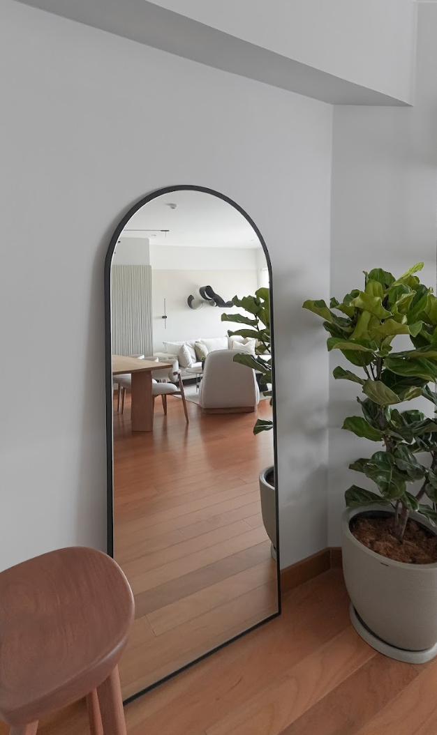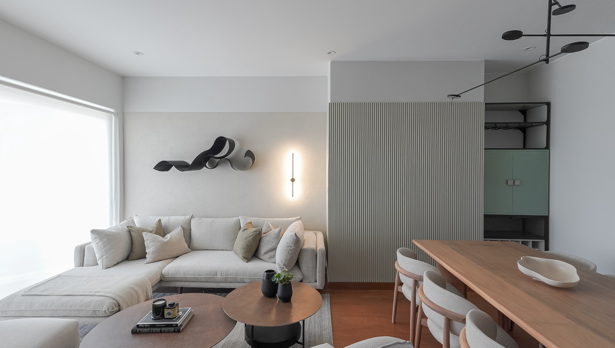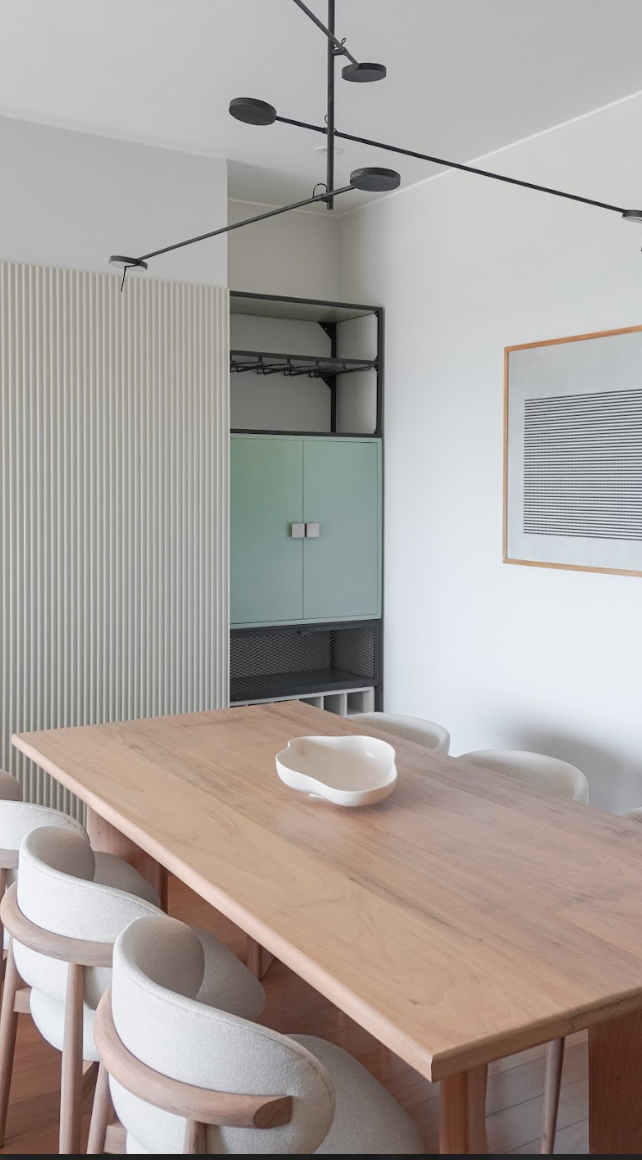 La sala comedor de Pablo respira paz y autenticidad. Las formas orgánicas y las plantas, junto a los acentos en verde y las texturas se complementan a la perfección, dándole a este espacio una personalidad única.