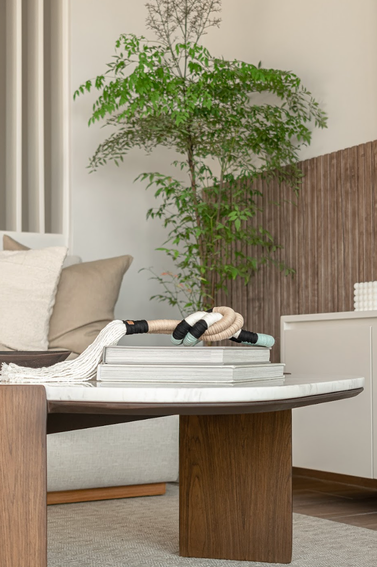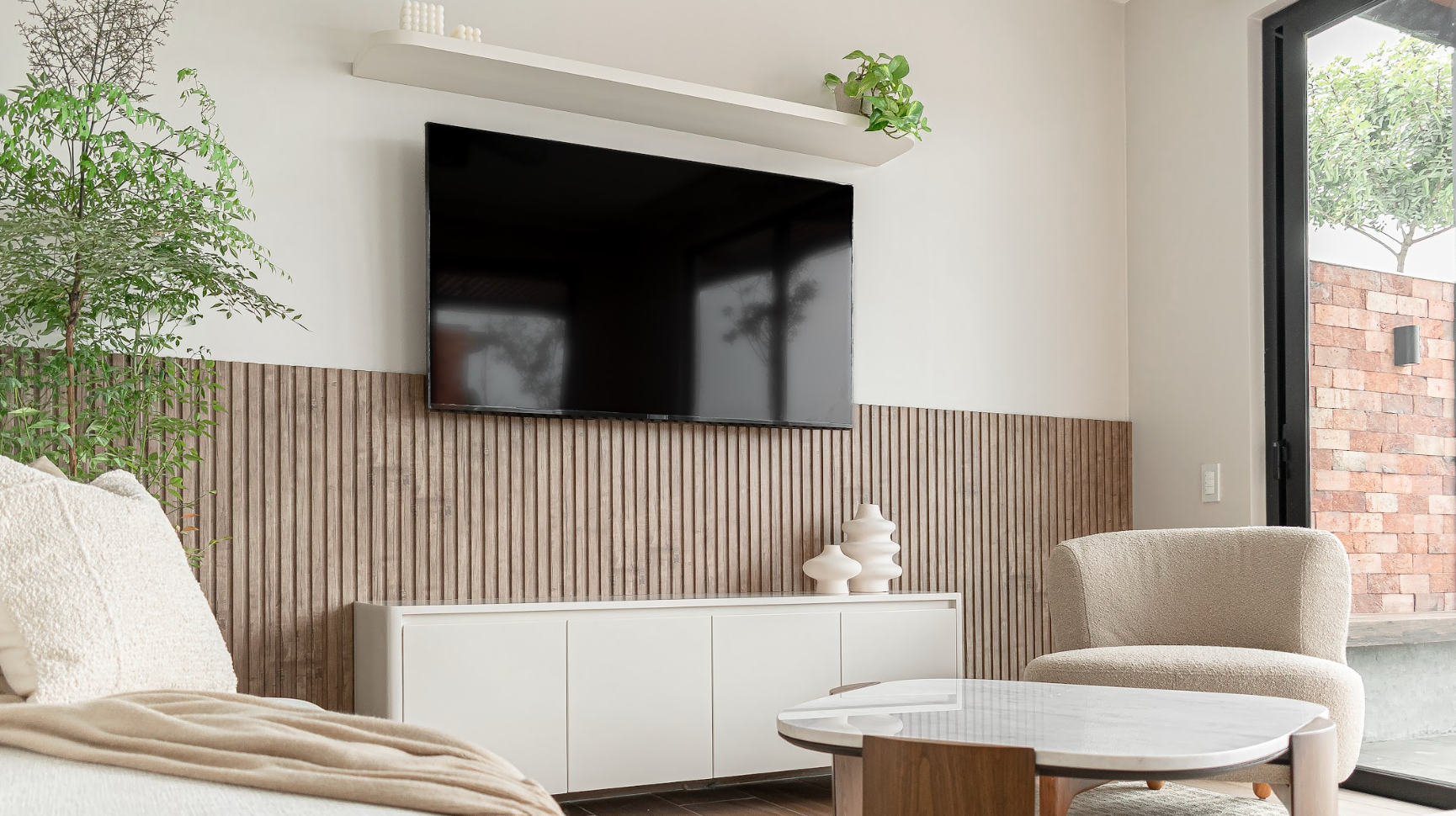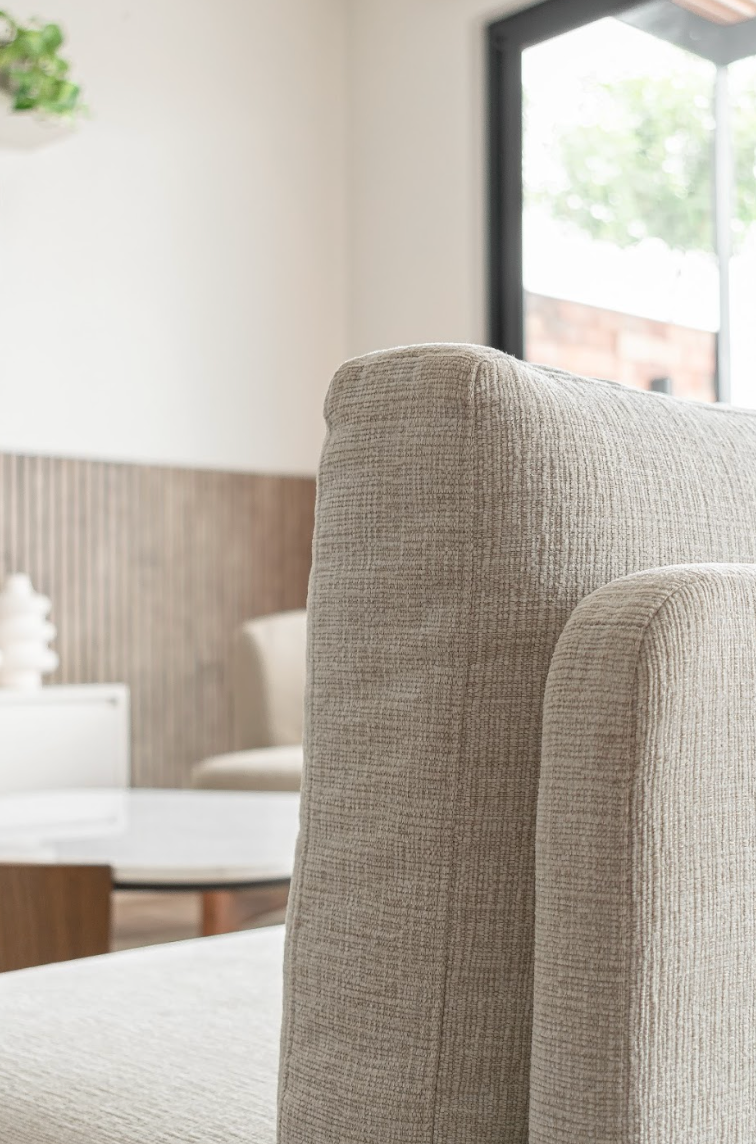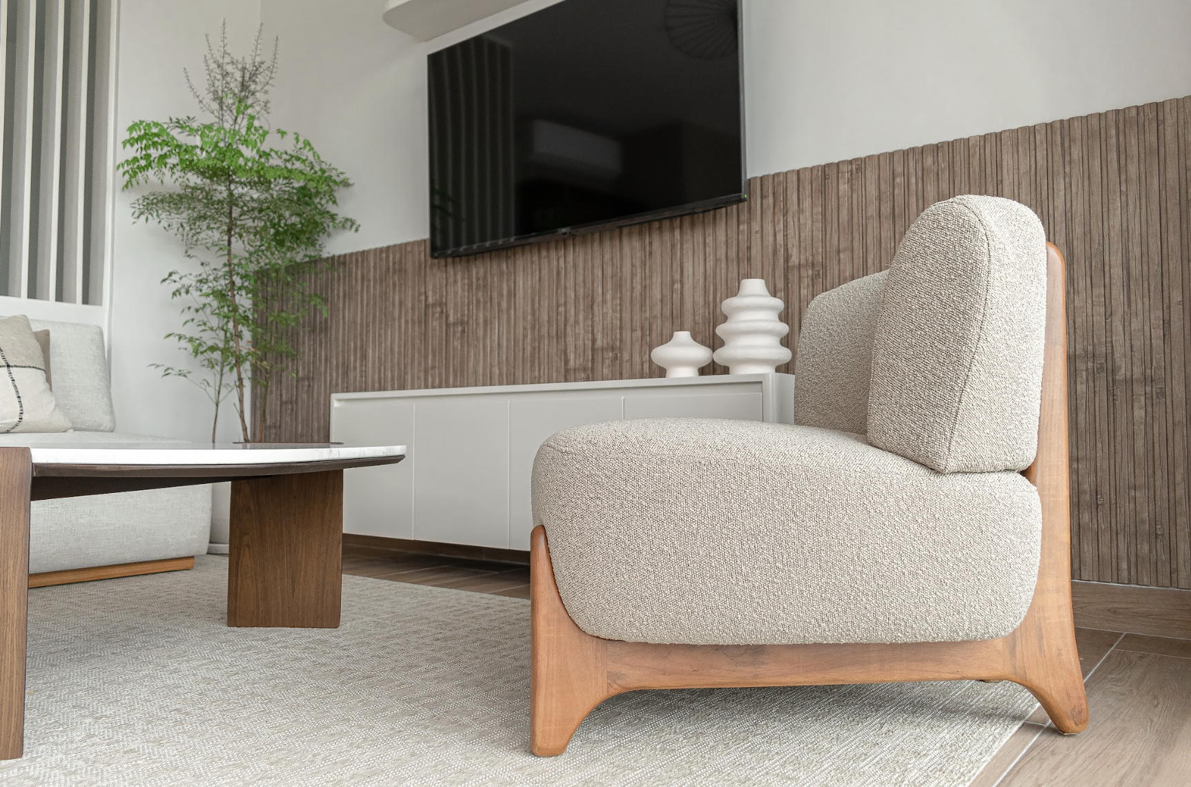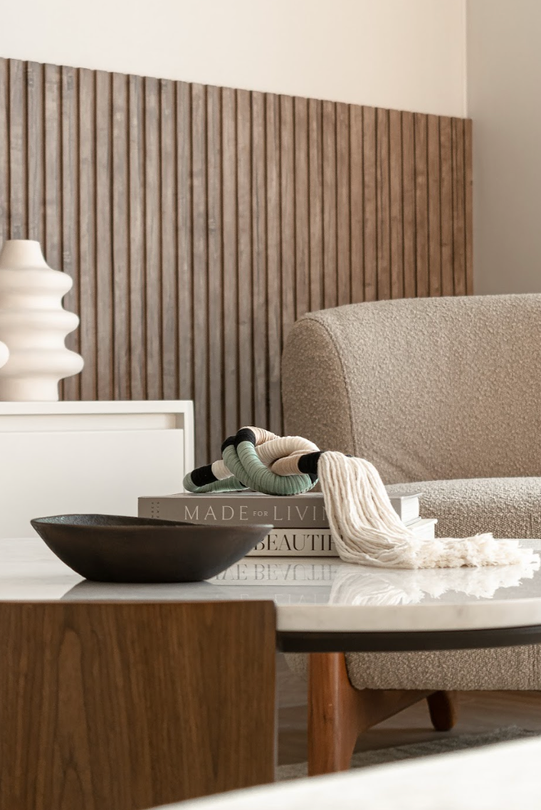 Un espacio que genere calma. Eso quisimos lograr en la sala de estar de Paloma & Cristóbal, un lugar donde reinan los tonos nude y se acompañan muy bien de acentos en madera.